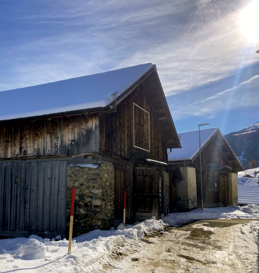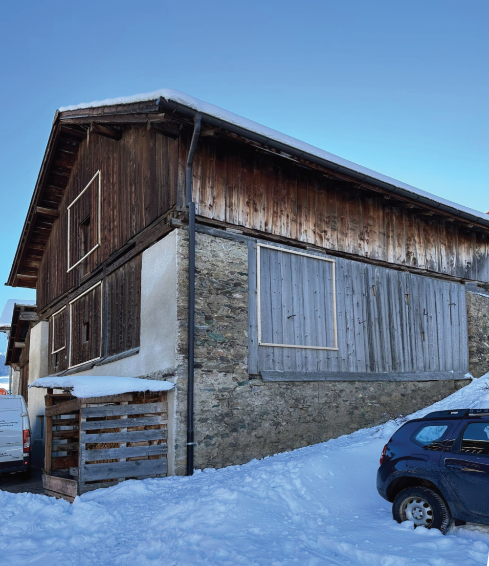 Der Stall in Riom-Parsonz überhalb Savognin steht wie andere Ställe im Dorfkern teils umrundet von bewohnten Häusern. Ihre Grösser übertrifft teilweise die Grösse der bewohnten Häusern. Oft stehen sie mittlerweile eher untergenutzt da, beherbergen im Innern hölzerne historische Objekte die früher unabdingbar waren. Der Umbau von Stall in Wohnung mit Einliegerwohnung wird den Stall auch nach den Arbeiten als Stall aussehen lassen. Es waren nicht nur der Ortsbildschutz der dies so vorgab, es war auch die Idee der Bauherrschaft dass dieses Kulturgut visuell bestehen bleibt. So zieht sich der Umbau hinter die offenen Natursteinecken und unter dem bestehenden Dach zurück, dass diese im Innern wie vom Aussenraum erkennbar bleiben. Das abgedunkelte und verwitterte Holz der Fassaden wird wenn immer möglich wiederverwendet an der Fassade selber. Die meisten Fenster liegen hinter Holzlamellen um den visuellen Aspekt der Stalles beizubehalten. Im Innern werden die beiden Wohneinheiten unterschiedlich behandelt, einmal in Vollholz und einmal im eher urbaneren Stiel mit mineralischen Böden. Die integrierte PV In-Dach-Anlage mit Wärmepumpe geben den neuen Wohnungen eine zeitgemässe Energiegewinnung. Nur wenige sichtbare Fenster lassen erahnen dass das Innere dem alten Äusseren ein neues Leben einhaucht.