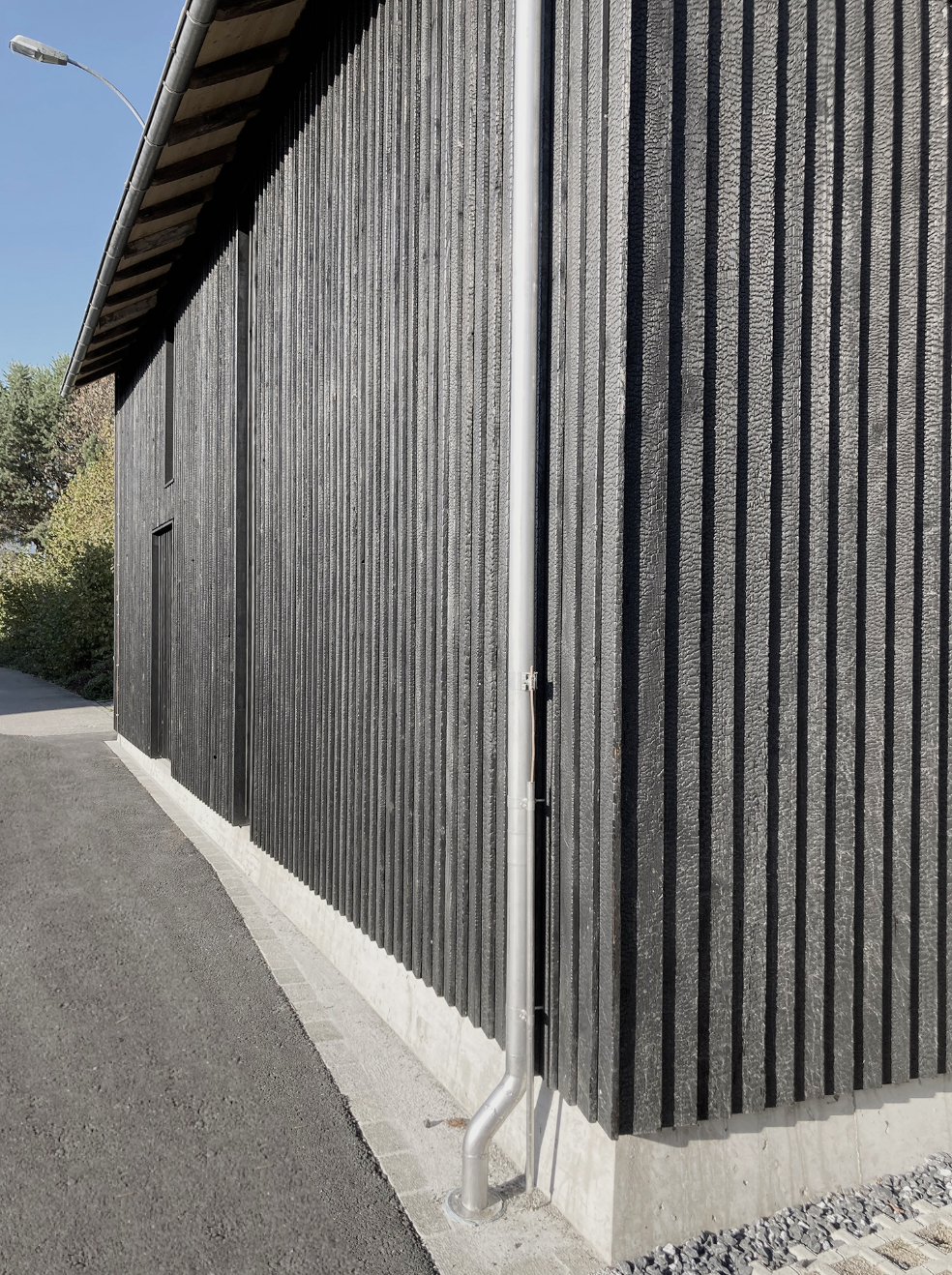 In ihrem Grundvolumen und der Dachform schaut die Scheune aus wie früher. Eine neue Stülpfassade mit Holz von Weisstannen wurde mit der Yakusuzgi-Methode verkohlt. Die Hölzer werden mehrere Generationen lang halten. Der Wiedererkennungswert bleibt für das geschützte Ensemble mit den Häusern hinten im Hof bestehen. Die Erkenntnis, dass die Scheune nun ein Wohnhaus ist, zeigt sich nur wenn Fensteröffnungen ersichtlich sind. Auf zwei Fassadenseiten hin sind die Fenster hinter manuell einstellbaren schwarzen Holzlamellen und je nach Betrachtungswinkel der Fassade nicht mehr ersichtlich.